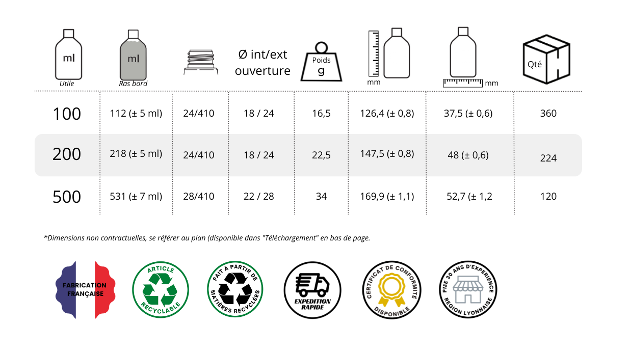 Flacon de la gamme "Douceur" en PET ambré est disponible en 100ml, 200ml et 500ml. Son aspect classique avec ses épaulements arrondis est très souvent utilisé pour le conditionnement de produits cosmétiques et beauté, aromathérapies, et biologiques. Ce type de contenant est compatible avec des accessoires en pas de vis de 24-410 tels que les pompes spray, les pompes dispenser et les capsules services.