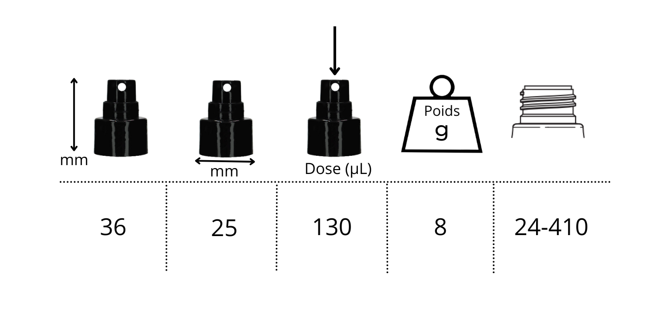 Ici, Dose130 signifie que la pompe expulse 130μL ou 0,130ml de produit en une seule pression complète.